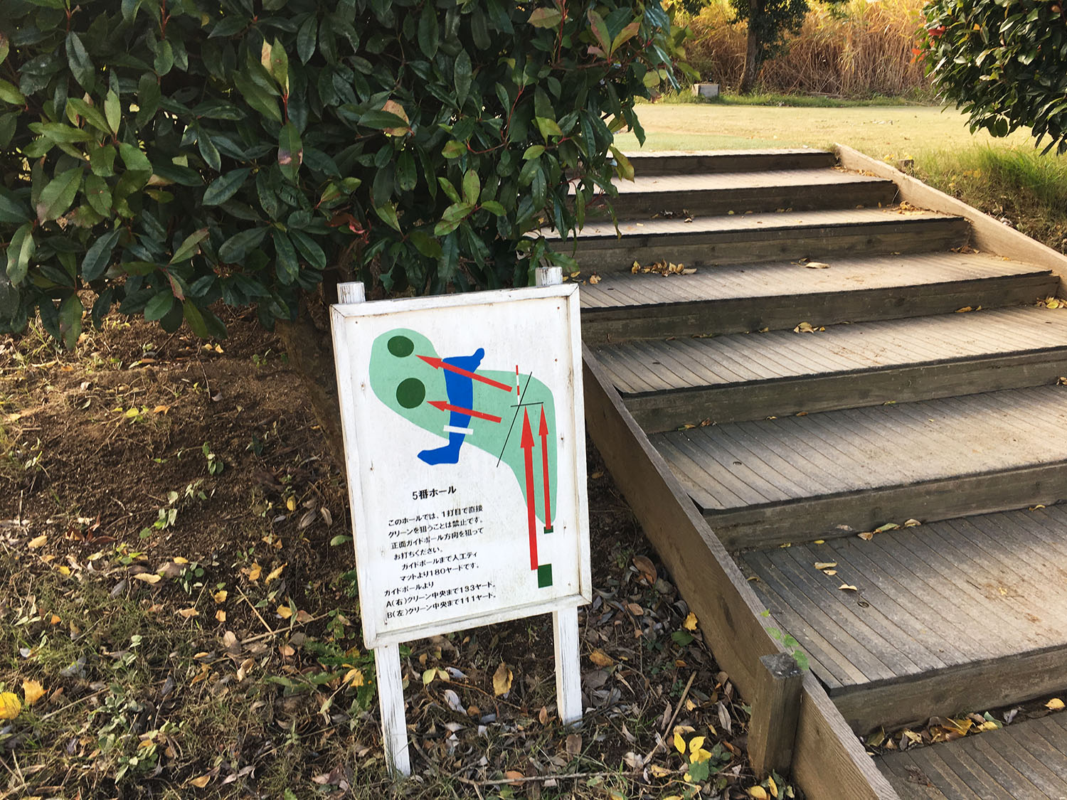 Besonders überrascht war ich vor der erstmaligen Annäherung zum Grün. Wie ich feststellte, besaß die Bahn zwei Grüns. Das zu bespielende Grün wurde mir durch den gesteckten Fahnenstock angezeigt. Wie ich von meinem Flightpartner erfuhr, ist die Anlage von zwei Grüns pro Bahn auf vielen japanischen Golfplätzen üblich. So werden die Grüns im täglichen Wechsel bespielt, wodurch sich die Golfclubs eine bessere Regeneration der Grünflächen erhoffen. Bei genauerem Blick auf meine Scorecard stellte ich auch tatsächlich fest, dass dort jeweils zwei Längenangaben pro Bahn aufgeführt waren.