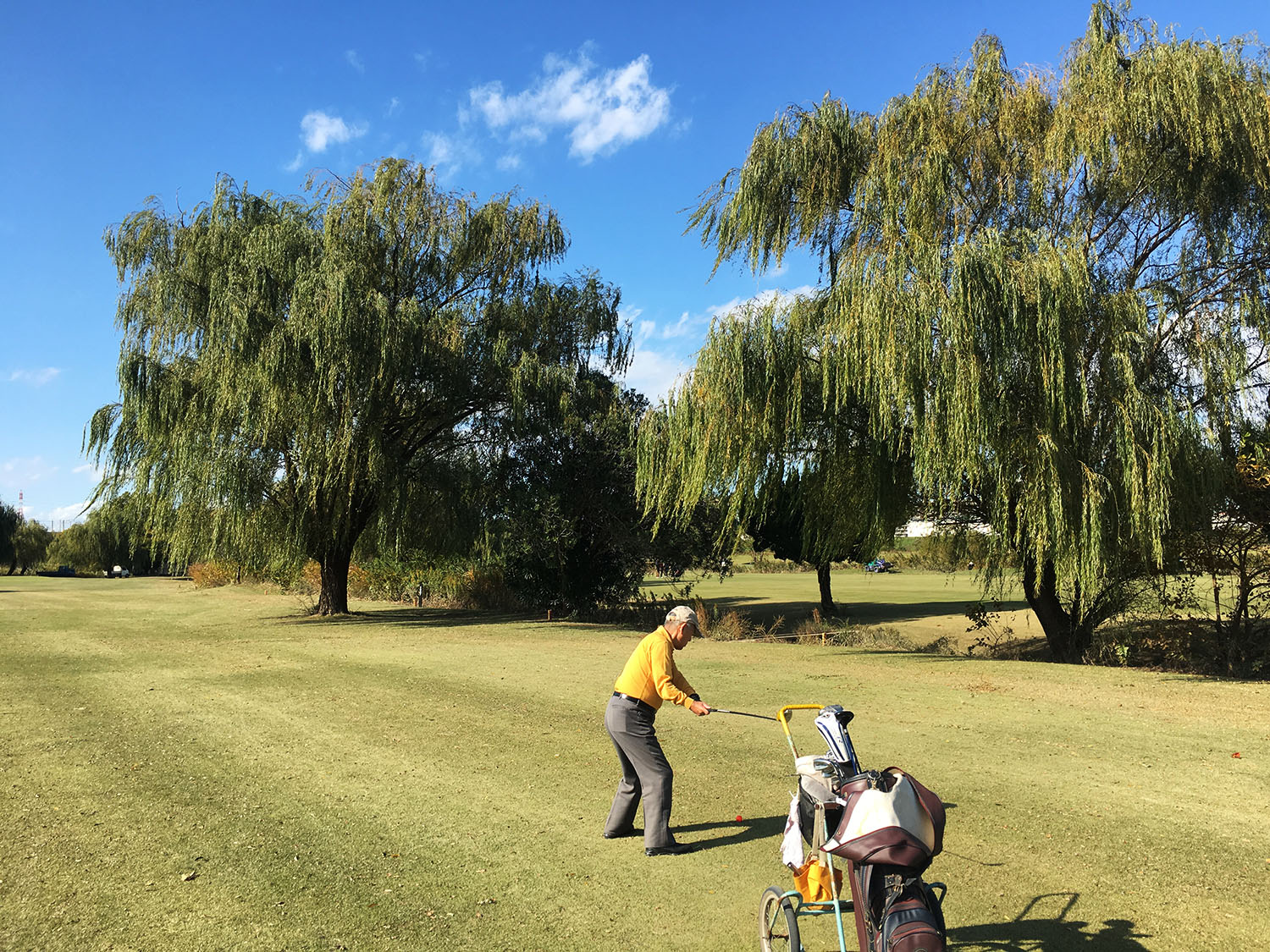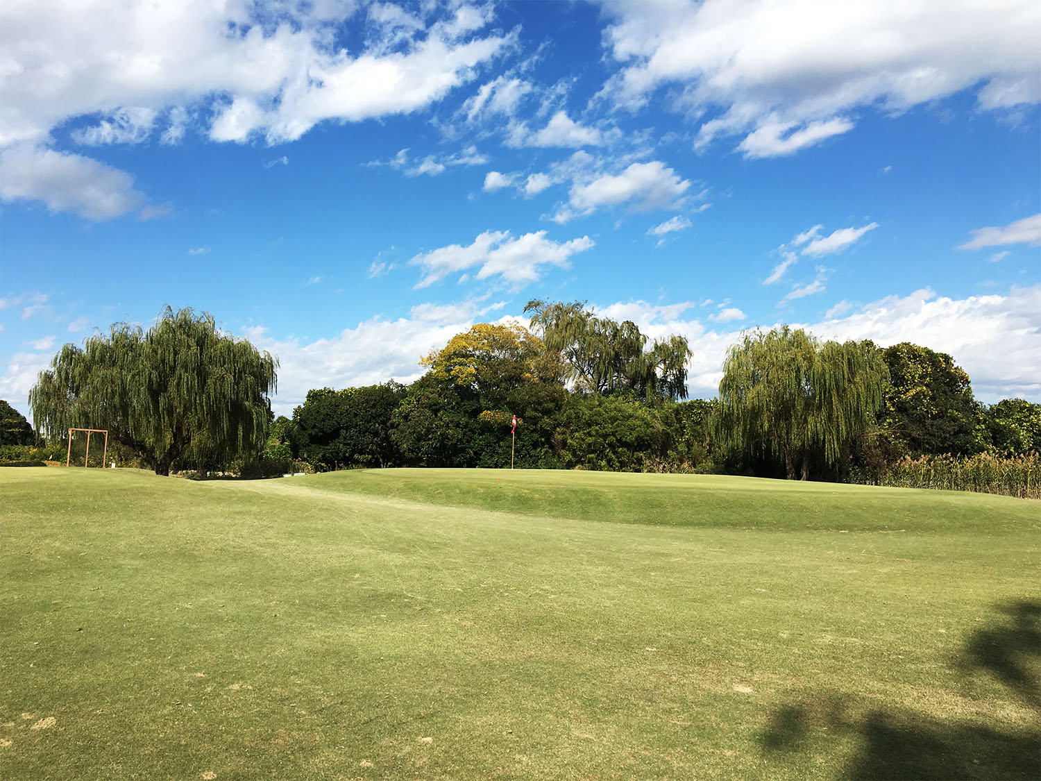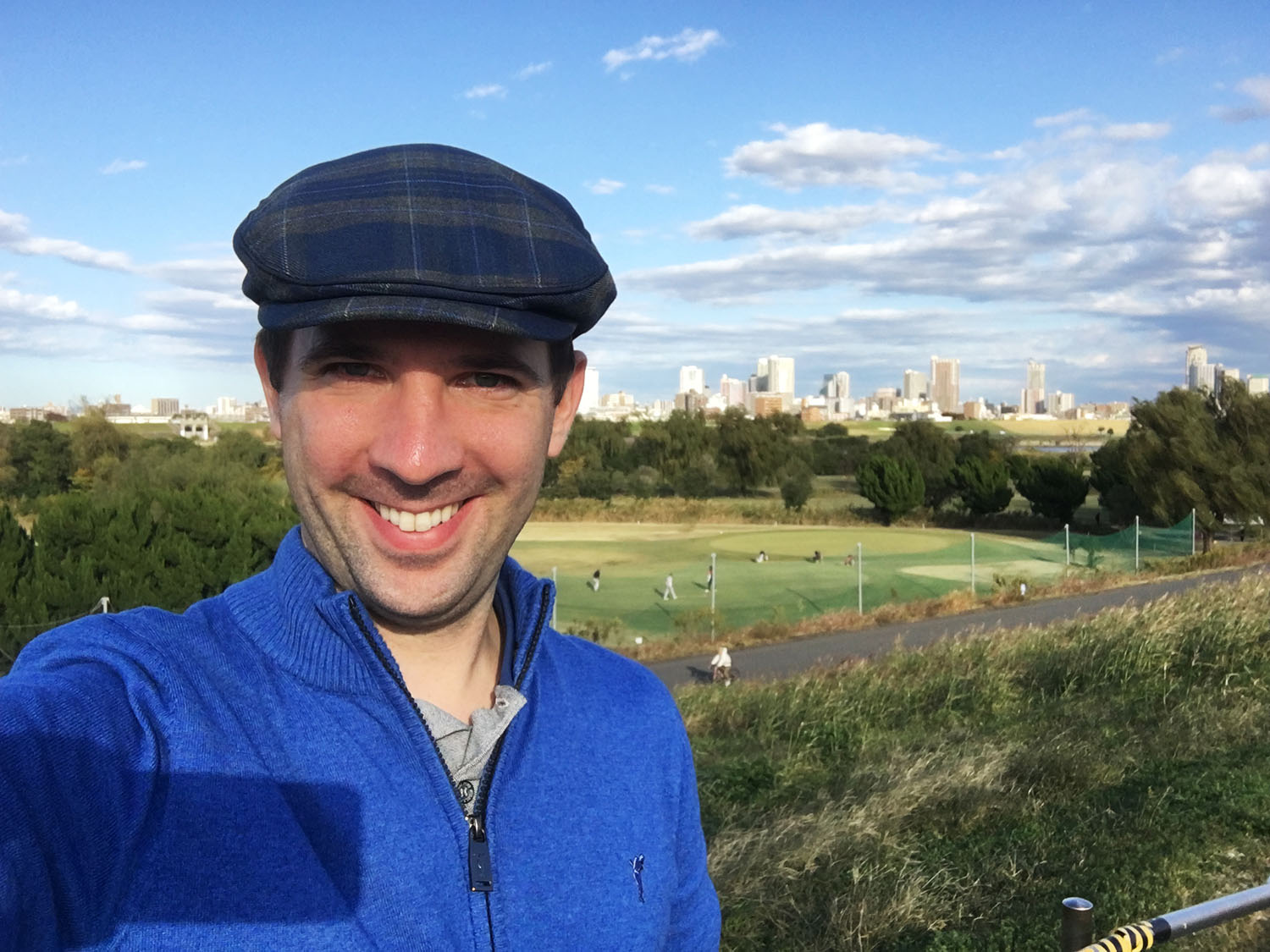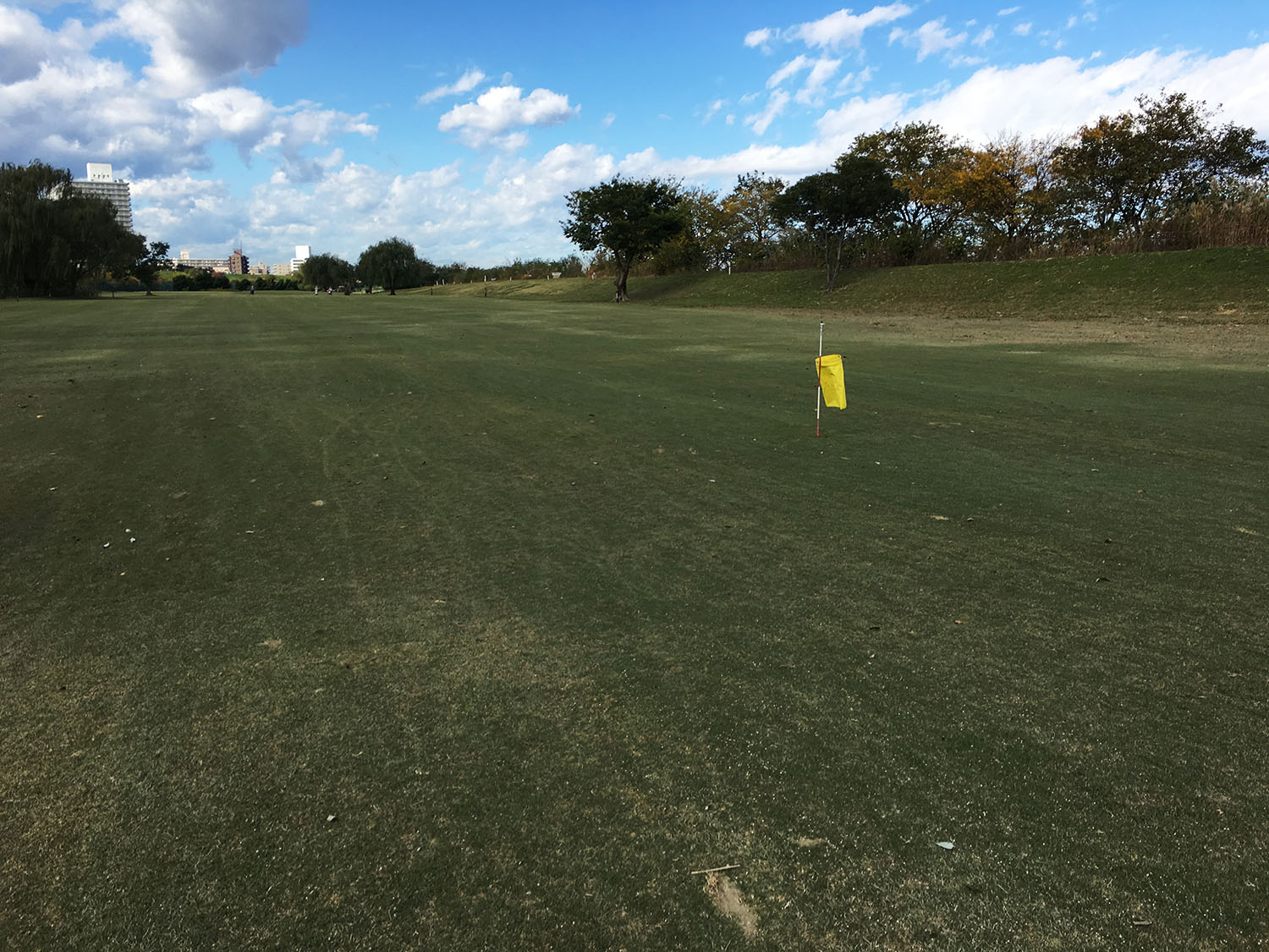 Gestärkt ging es dann zurück auf den Platz. Mit zunehmendem Verlauf der Runde verflog meine Verwunderung und ging in reine Spielfreude über. Der Platz war trotz der späten Jahreszeit in einem sehr guten Zustand. Landschaftlich war dieser toll angelegt und hielt neben einzelnen Teichen eine Vielzahl asiatischer Bäume und Pflanzen, darunter aber auch einige anmutig erscheinende Trauerweiden und Palmen. Der Platz lag direkt neben dem Fluss Arakawe und ließ nicht nur Blicke auf diesen, sondern auch auf die Tokioter Skyline in der Ferne zu. Einziges Manko des Golfplatzes war, dass das Areal bis in die 1970er Jahre Teil des Flusses war und die einzelnen Bahnen direkt auf dem ehemaligen Flussbett angesiedelt wurden. Der Boden war daher vergleichsweise hart und erschwerte gerade das Spiel mit hohen Eisen.