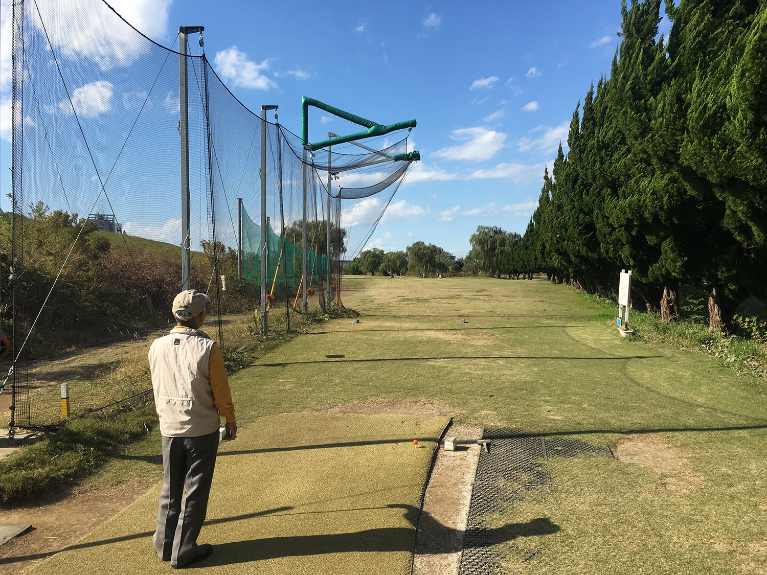 Meine Verwunderung nahm zu als ich bereits am ersten Abschlag Fangnetze entdeckte, die sich unmittelbar neben und über dem Abschlag befanden und somit nur ein eingeschränktes Fenster zum Durchspielen zuließen. Im Verlauf der Runde stellte ich fest, dass diese auch bei drei weiteren Abschlägen angebracht waren. Takeshi erklärte mir, dass diese verhindern sollen, dass die Abschläge zu weit abseits des Fairways landen und dass eine Berührung der Netze straflos bleibt bzw. eine straflose Wiederholung des Abschlags zulässt.